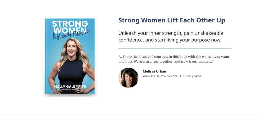 Molly’s website is simple but powerful. Along with a bio, she offers a free chapter of her book, “Strong Women Lift Each Other Up,” as an enticing lead magnet.